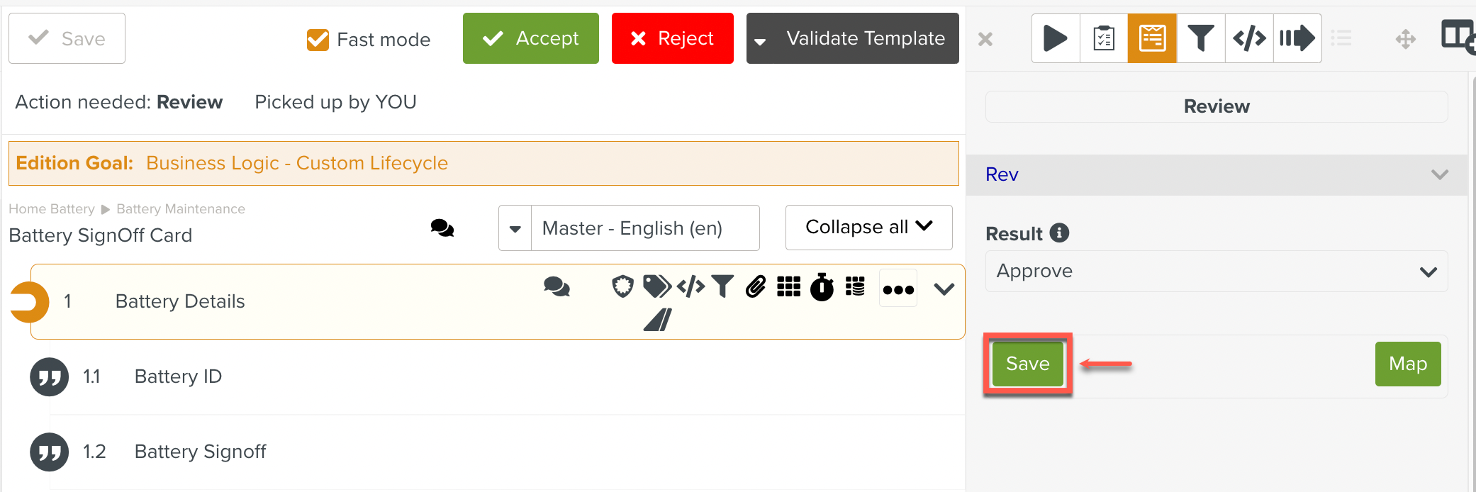 If the Reviewer enters Accept, the Template moves to the Approve Stage.