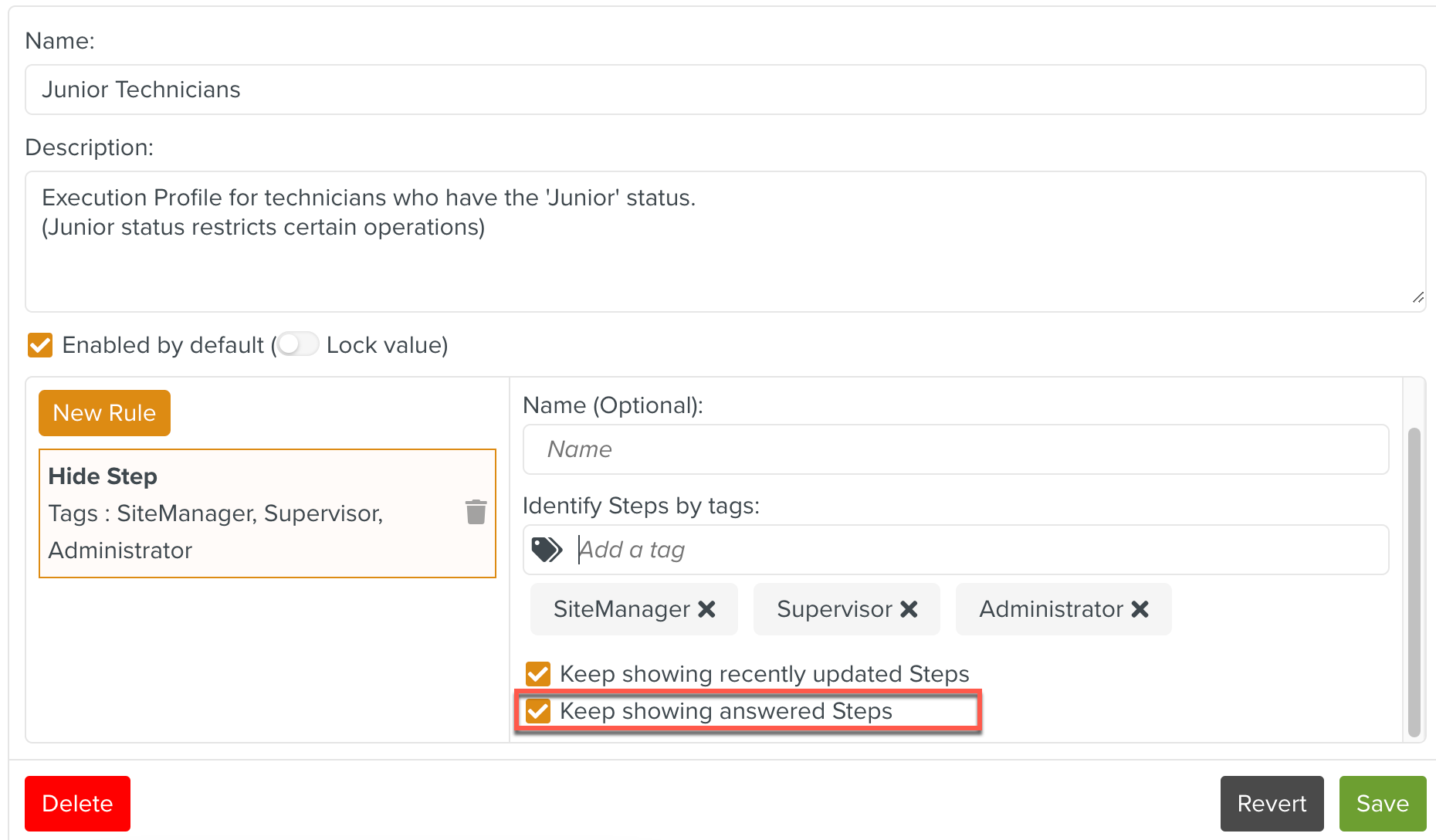Execution Profiles enable you to present the same Task differently to different members. When certain Steps of a Task need to be disabled or highlighted differently for certain groups of members, an Execution Profile can be applied at runtime. For example, a sign-off Step in an inspection Task may need to be disabled for all users except authorized personnel.