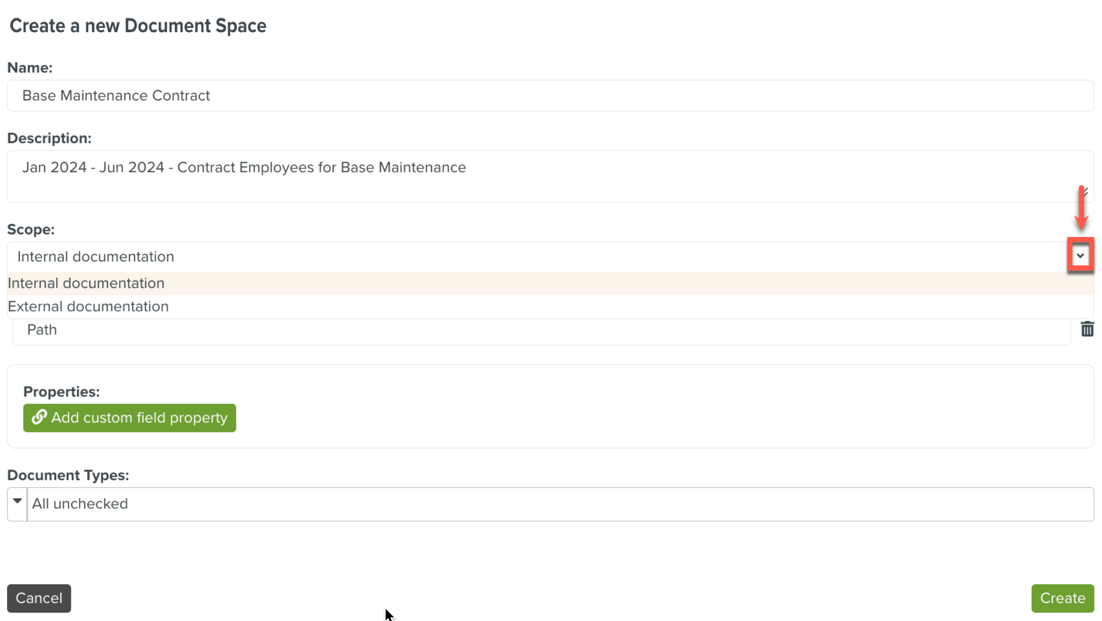 The Document Type selected here will define the type of Document that can be created in this Document Space.