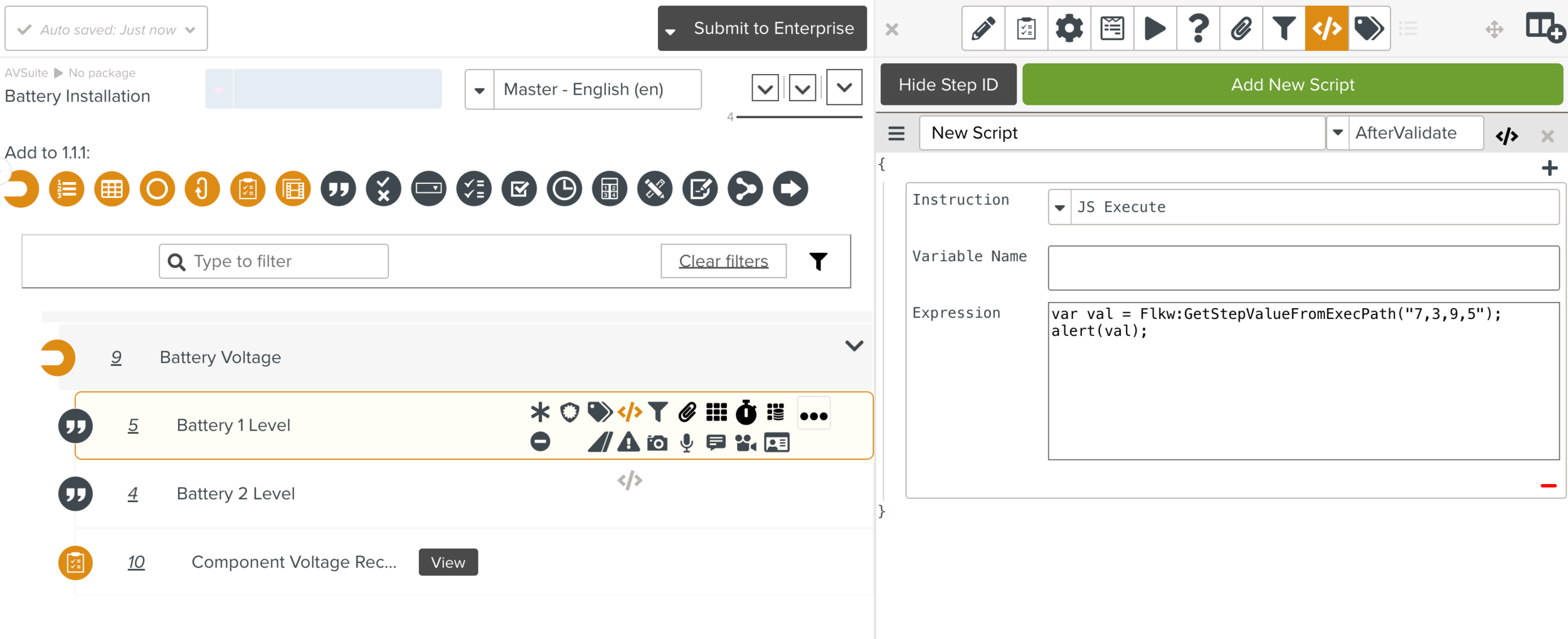Flkw:ValidateStepWithValueFromExecPathScript Instruction is added to the Script as shown above.In the example, the Execution Path value of 7,3,9,4 points to the Step of ID (4). The value of Step of ID (4) is stored in the variable 'val'.