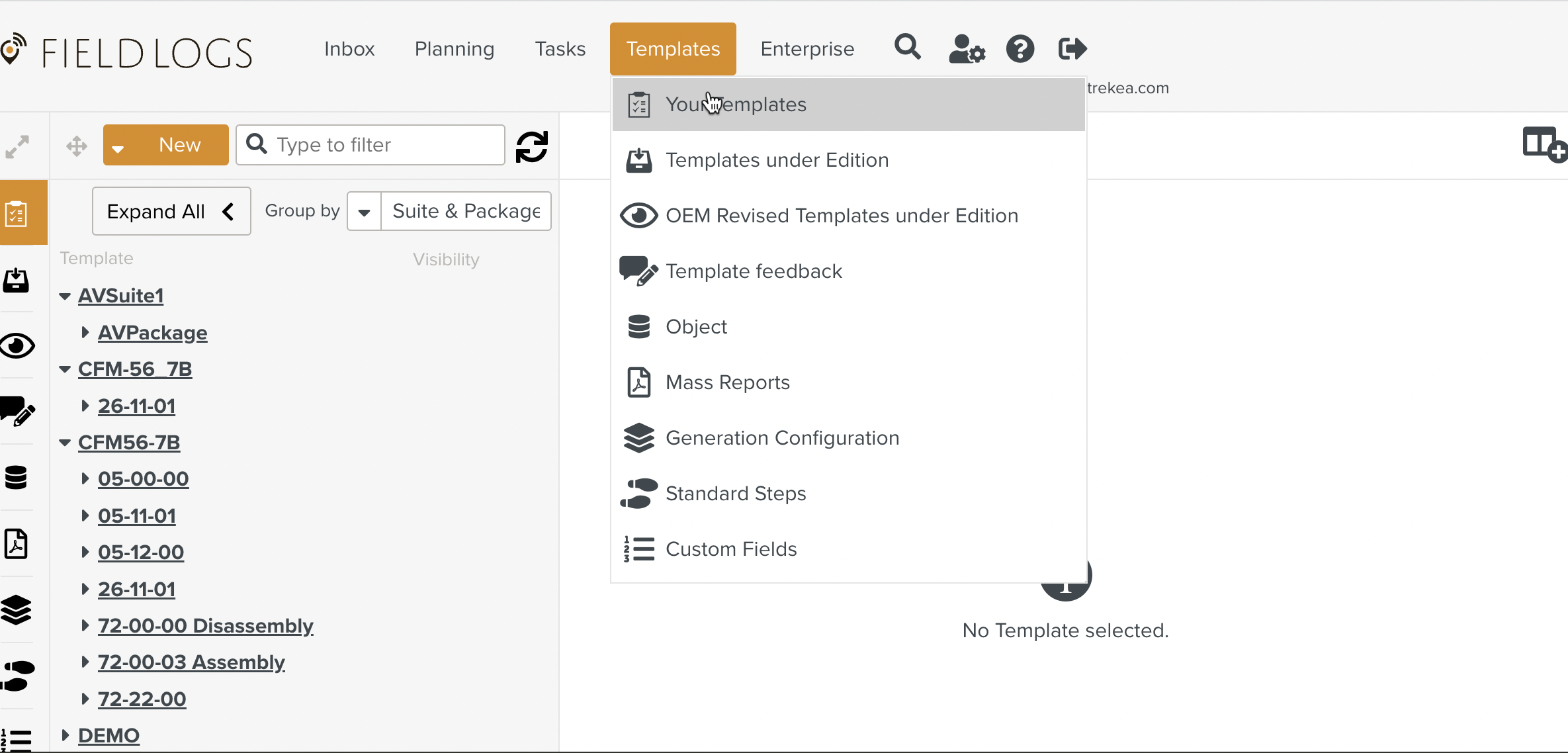 The Suite and Package names with the corresponding count of Templates are displayed.