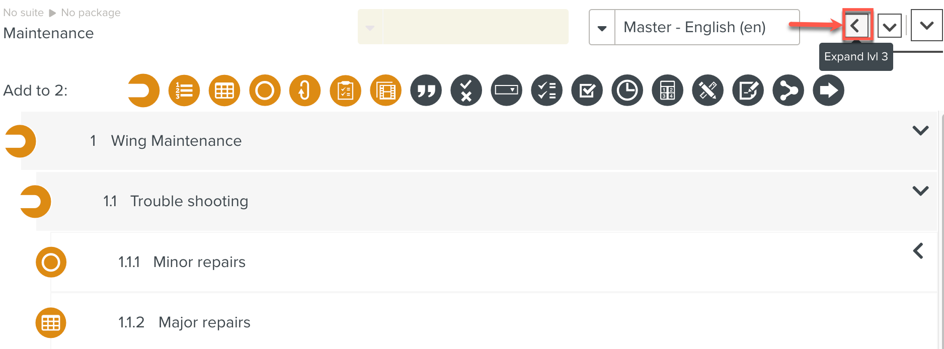 While browsing through long Templates containing several levels of Steps, it might be useful to view all Steps of a certain level at once. The Expand/Collapse buttons can be found in the top right corner of the workspace pane.