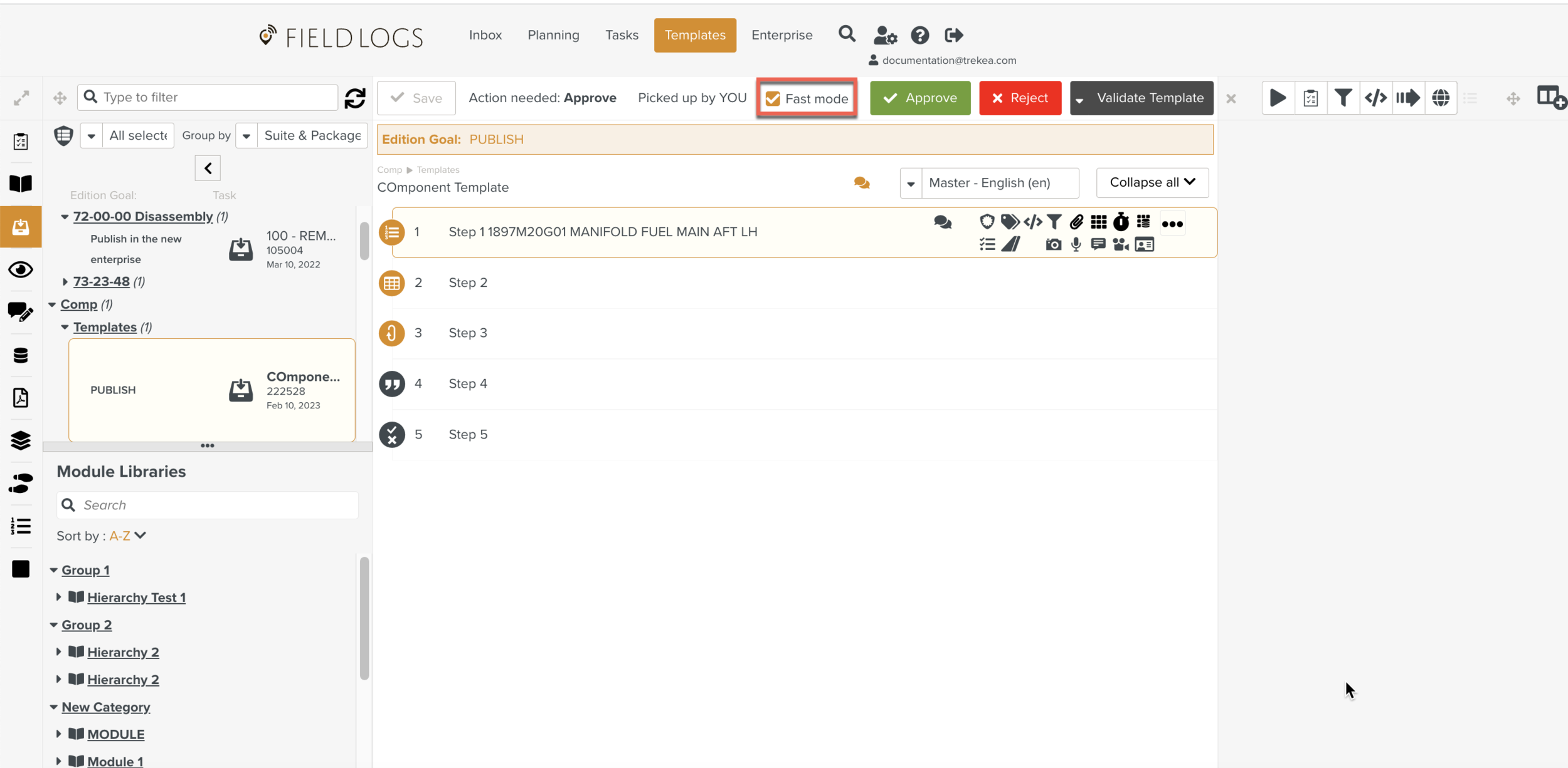 Notice the Template status in the property pane. The action bar displays the action needed.