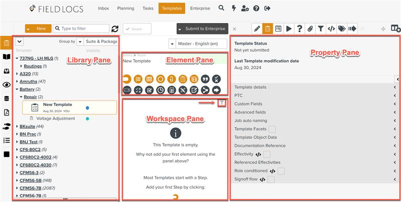 Element Pane: This section contains all the Elements that can be dragged into the Workspace Pane to create a new Template. Each Step in a Template is an Element.